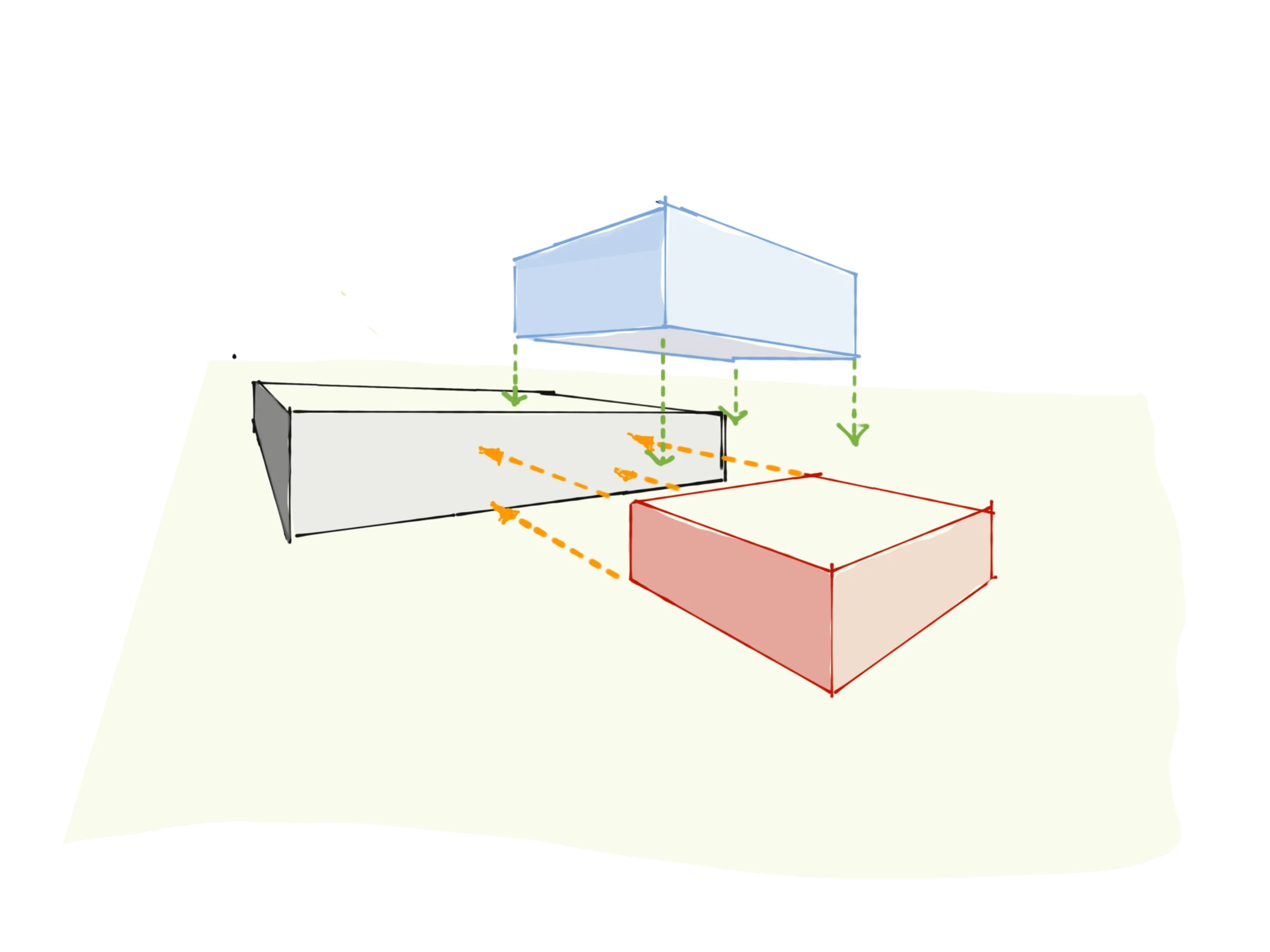 The solution centered around reimagining the kitchen as the focal point, connecting dining, living, and backyard areas to establish a contemporary open-plan design. Schimaticly the house is 3 blocks. (In Gray) The original footprint (Red) new 2-car garage on the front, and (Blue) the master suite on top.